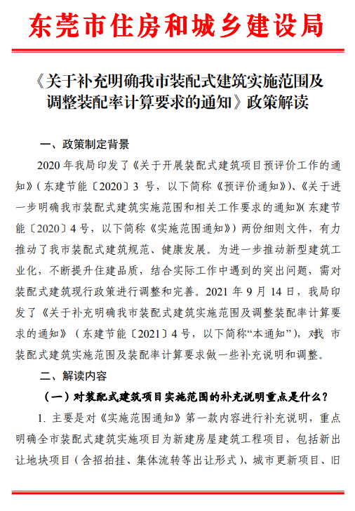 為進一步推動新型建筑工業化,不斷提升住建品質,9月14日,東莞市住建局發布《關于補充明確我市裝配式建筑實施范圍及調整裝配率計算要求的通知》。近日,東莞市住建局對該通知進行政策解讀,提煉“三個重點”。