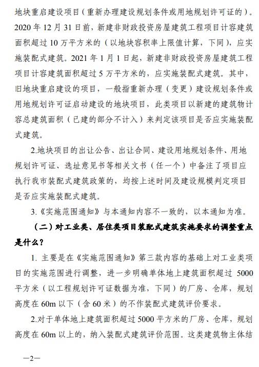 2020年12月31日前,新建非財政投資房屋建筑工程項目計容建筑面積超過10萬平方米的(以地塊容積率上限值計算,下同),應實施裝配式建筑。2021年1月1日起,新建非財政投資房屋建筑工程項目計容建筑面積超過5萬平方米的,應實施裝配式建筑。