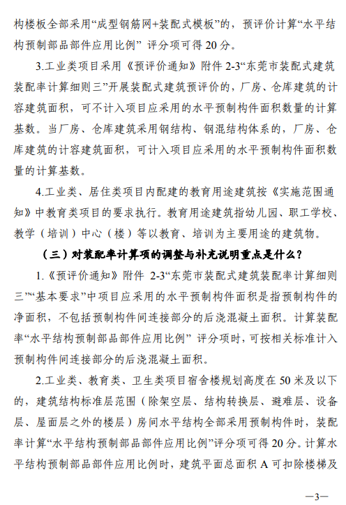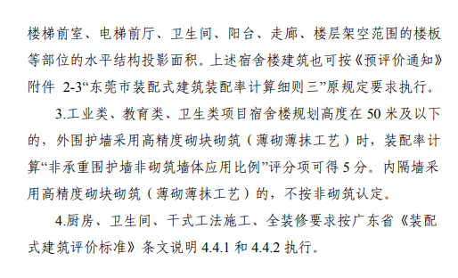 該通知對裝配率計算項的調整與補充進行解釋說明。《預評價通知》附件2-3“東莞市裝配式建筑裝配率計算細則三”“基本要求”中項目應采用的水平預制構件面積是指預制構件的凈面積,不包括預制構件間連接部分的后澆混凝土面積。計算裝配率“水平結構預制部品部件應用比例”評分項時,可按相關標準計入預制構件間連接部分的后澆混凝土面積。